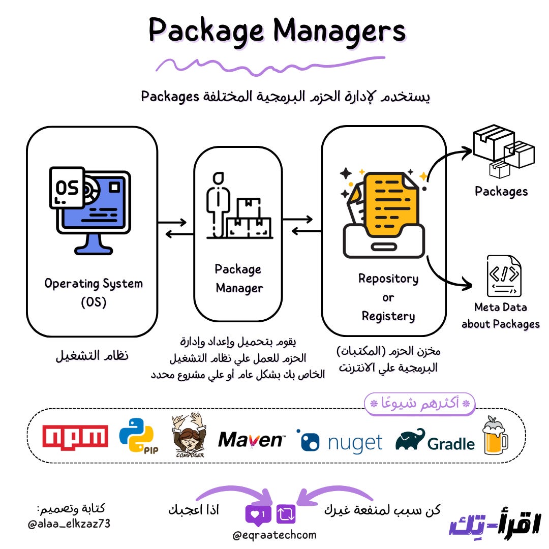الـ Package manager هو مساعد المبرمج المخلص في كل مشاريعه، فلو شغال Frontend هتلاقيك بتستخدم npm ولو شغال Backend فلكل لغة package manager بردو زي composer في PHP ولو شغال مع الذكاء الاصطناعي أو هندسة البيانات أو لغة python عامة فهتلاقيك بتستخدم pip