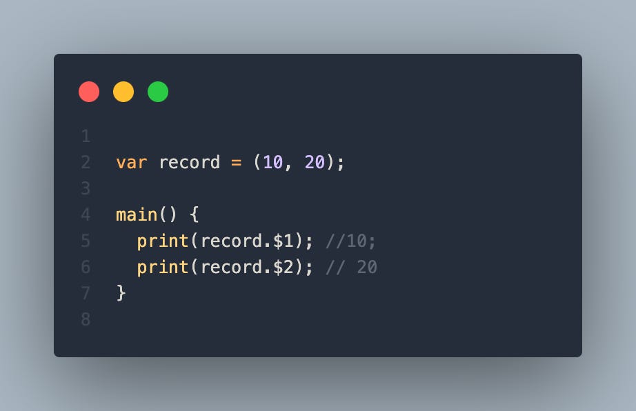 في المثال ده، عملنا record من خلال قوسين وأدخلنا القيم بشكل مفصول. الـ record هنا بيحتوي على متغيرين مختلفين. بنستدعي القيم باستخدام $ وأول قيمة بيكون رقمها 1، بعكس باقي الـ data structures اللي بتبدأ من الصفر.