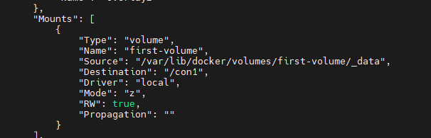 من ضمن المعلومات دي ال mount ودي بيكون فيها المعلومات المتعلقة بال volume الخاصة بال container دا وهنا بيقولي ان ال container بيستخدم ال volume ال اسمه first-volume وال destination بتاعه ال هو ال folder الخاص بال container دا داخل ال volume دا اسمه cont1