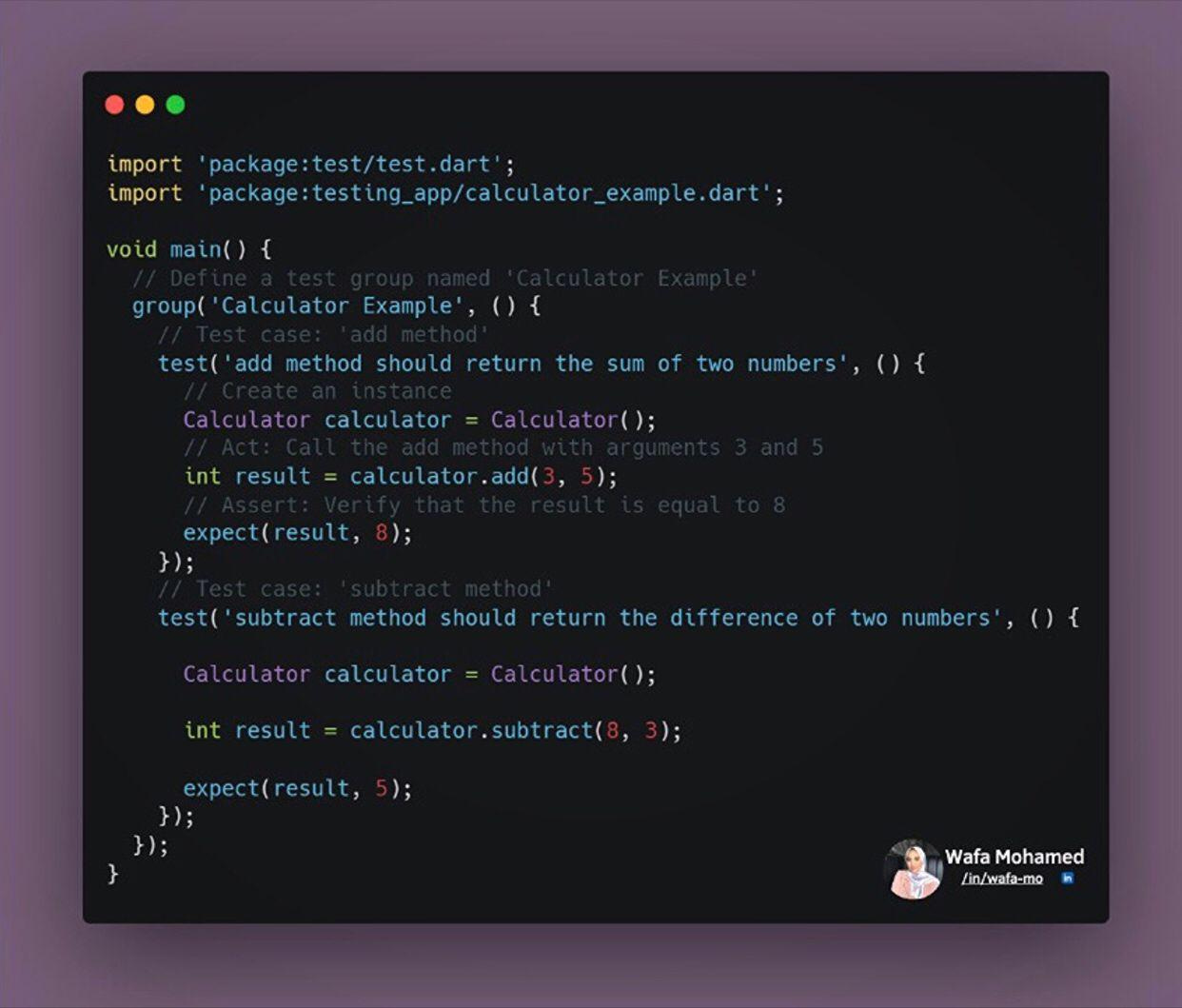 testing_app/lib/example_page.dart/test/example_unit_test.dartبعدها هتحط الـ main function عشان دي هتبقا الـ entry point للـ tests بتاعتك. وبعد كدا عندك Three methods مهمين جدا: