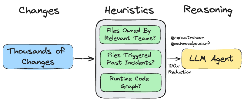 النظام بيستخدم "heuristics-based retriever" جديد، قادر إنه يقلل مساحة البحث من آلاف التغييرات لعدد قليل من مئات التغييرات من غير ما يقلل الدقة بشكل كبير، زي مثلاً استخدام "code and directory ownership" أو استكشاف "runtime code graph" للأنظمة المتأثرة. فبعد ما بيقللوا مساحة البحث لعدد قليل من التغييرات المهمة للتحقيق الجاري، بيعتمدوا وقتها على نظام "LLM-based ranker" عشان يحدد السبب الجذري وسط التغييرات دي كلها ويختزلهم لعدد بسيط مكون من 5 Candidates يدوروا فيهم.