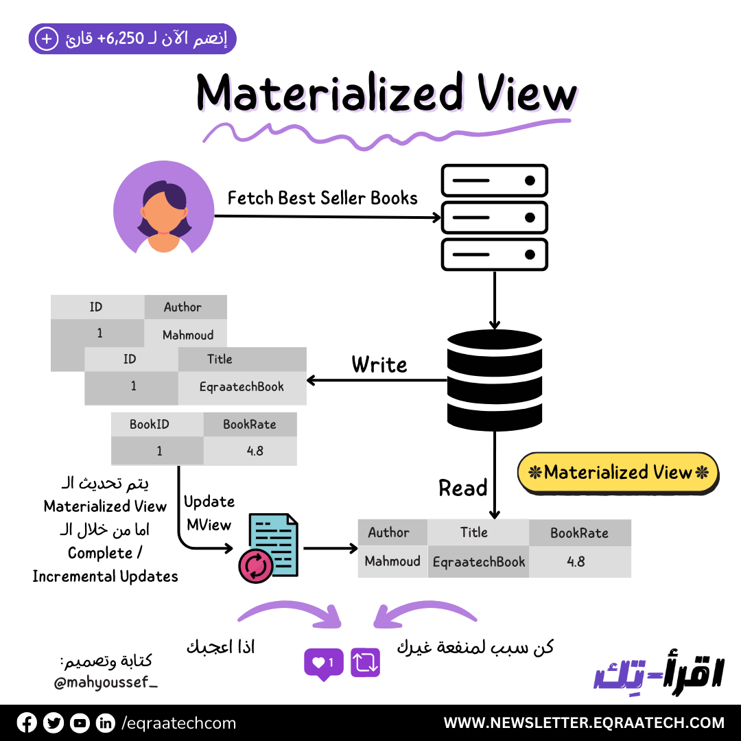 الـ Materialized View مش مجرد Query بتتنفذ كل مرة زي الـ Views العادية. ولكن هي بتنفذ الـ Query مرة واحدة بس وتخزن النتيجة فعليًا في جدول جديد جوا الـ Database.