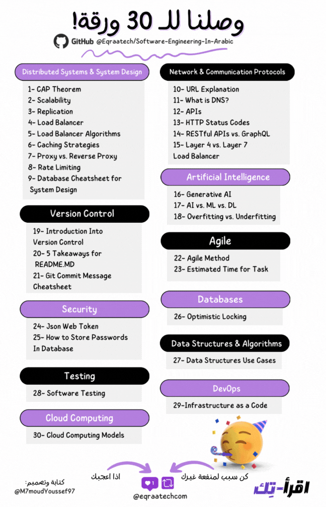 ده كمان عملنا GitHub Repository وحطينا فيها الـ 30 ورقة بجودة عالية عشان نشجع الناس تساهم معانا في اثراء المحتوى العربي، وباذن الله تكون من أكبر الـ Repos العربية واللي تسهل للناس فهم المفاهيم البرمجية باللغة العربية. 🚀