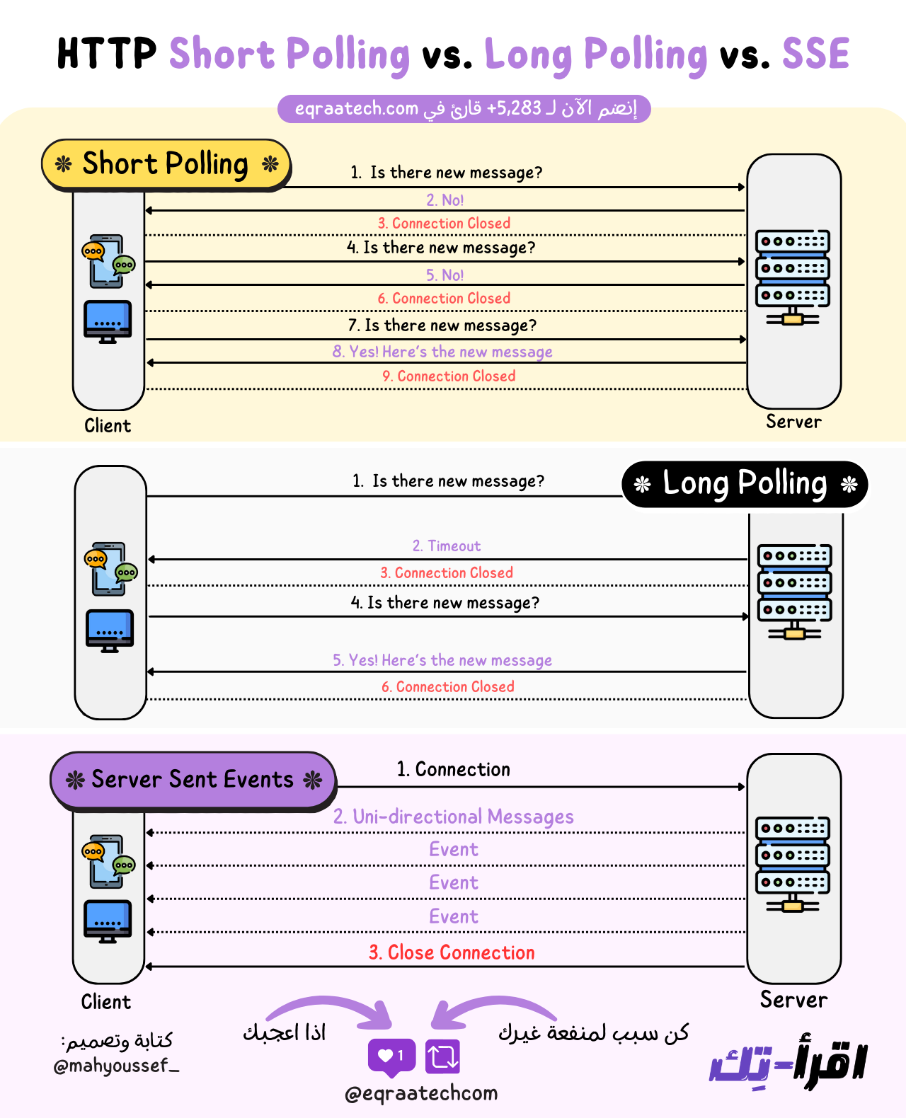 انهاردة هنتكلم عن 3 من التقنيات المهمة جدًا واللي مهم جدًا نكون عارفين الفرق بينهم اثناء تصميم Realtime Web Applications والـ 3 تقنيات دول هم الـ Long Polling , Short Polling , Server-Sent Events.
