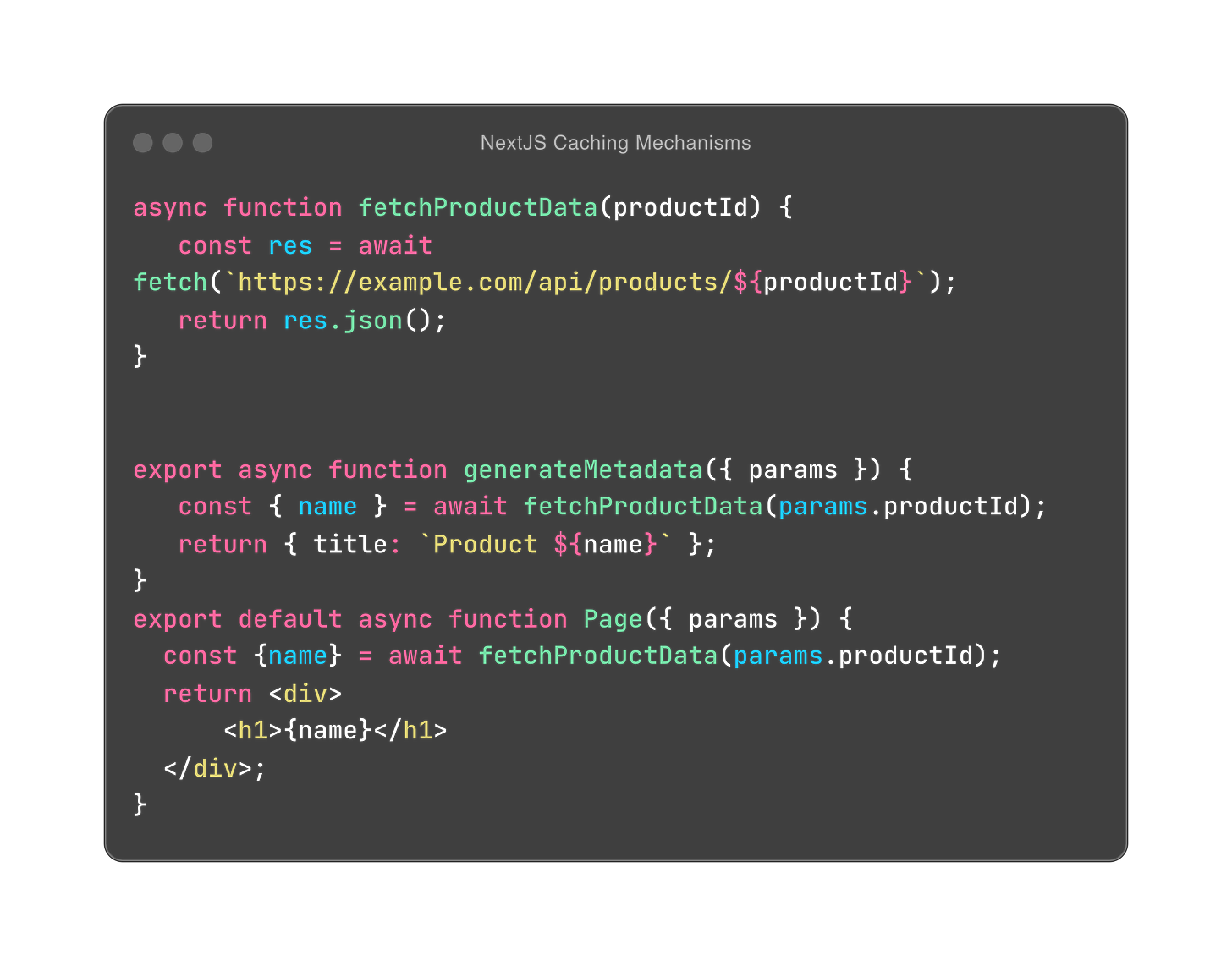 الـ Request Memoization في Next.js بتشتغل على تخزين نتيجة الrequests اللي ليها نفس الـ URL وال options. يعني بدل ما التطبيق يعمل request للبيانات في كل مكان، هيعمل request واحد ويبقى عامل memoize للنتيجة، وكل الcomponents الخاصة بال page او ال route اللي محتاجه البيانات هتستفاد من الcache ده.- مثال عشان الموضوع يوضح بشكل أكبر- لنفترض إنك عندك e-commerce وعندك صفحة بتعرض كل منتج, هنا عشان تحسن ال SEO محتاج إنك تظبط ال meta data الخاصة بالصفحة بتاعتك فهتبدأ إنك تعمل fetch للداتا الخاصة بالمنتج عشان ال title وال meta description علي سبيل المثال .