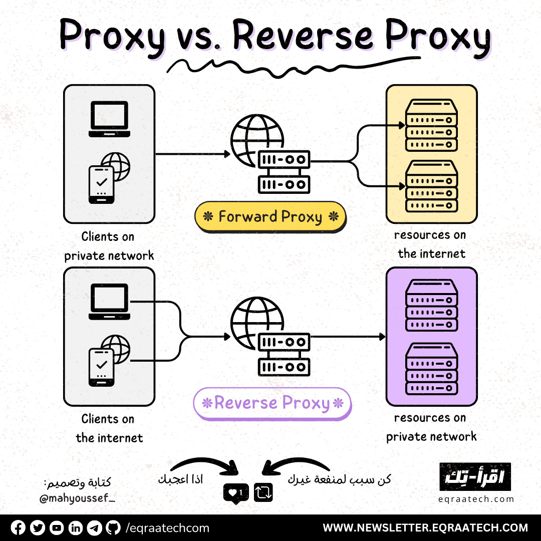 الـ Proxy بكل بساطة بيتمثل دوره في كونه عبارة عن وسيط بين الـ Clients والـ Servers، وفيه نوعين ليه وهم الـ Forward Proxy والـ Reverse Proxy