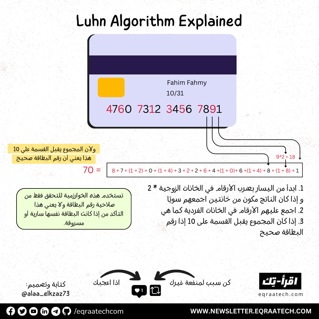 استكمالاً لكلامنا عن أساسيات ال Fintech هنتكلم النهارده عن خوارزمية لوهن (Luhn Algorithm) أو Mod 10 Algorithm وهي خوارزمية رياضية بسيطة طورها العالم الألماني "هانز لوهن"في الخمسينات، وبنستخدمها بشكل كبير في أنظمة التحقق من صحة أرقام البطاقات البنكية زي ال Debit/Credit