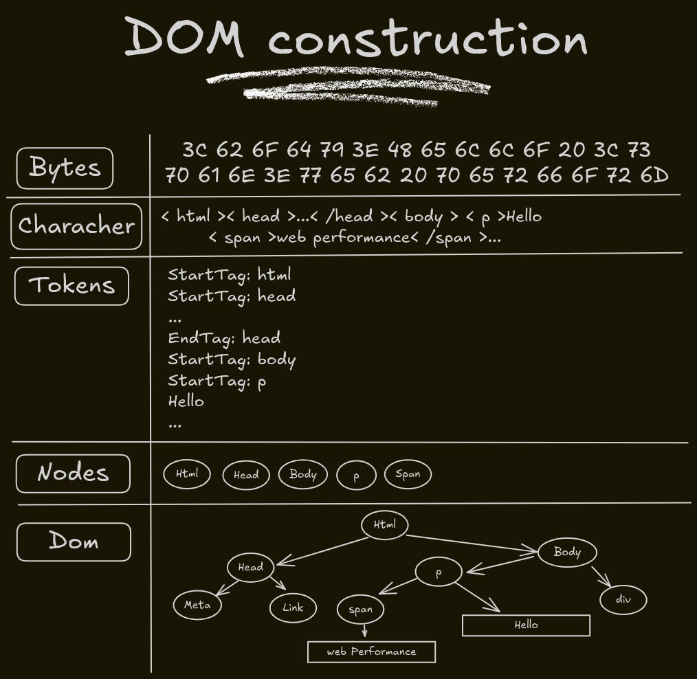 أول ما المتصفح ما بيستلم أول جزء من البيانات من السيرفر واللي بتكون عبارة عن مجموعة bytes متمثلة في ملف ال HTML، بيبدأ يحلل البيانات دي (يعملها parsing) ويوصل في النهايه ل Dom object model ودا بيتم عن طريق بعض الخطوات .