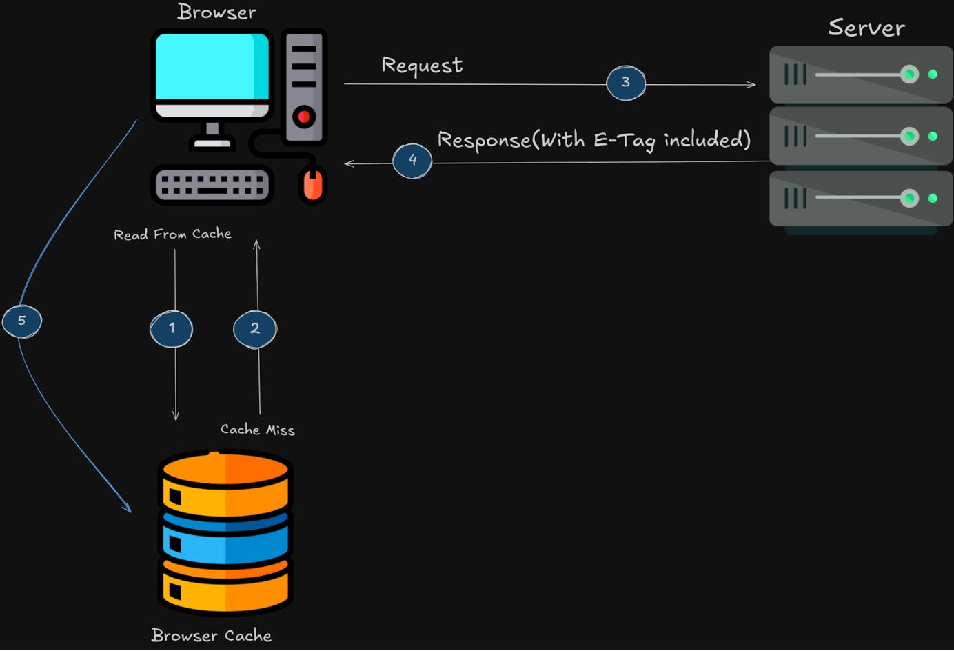 أي request بيتم إرساله الى الـ server بيمر في الأول علي الكاش وبيقوم الـ browser بفحص الـ resource إلى راجع في ال response هل موجود عنده في الـ cache ولو موجود بيرجعة بدون ما يضطر يعمل request جديد ل الـ server ولو مش موجود بيحصل ما يسمى بالـ Cache miss وهنا يبدأ الـ browser يبعت request ل الـ server علشان يجيب الـ resource اللي محتاجه.