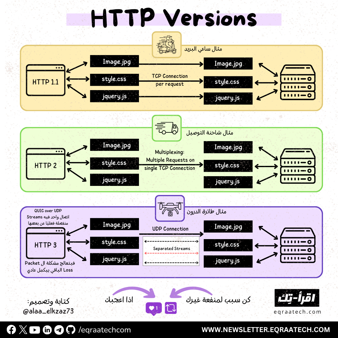 فلما نتكلم عن الـ HTTP ما هو إلا قوانين تنظم طريقة إرسال واستلام البريد أو الطرود و الإصدارات المختلفة ما هي إلا تحسينات على الطريقة دي عشان نخليها أكفأ وأسهل وأسرع.