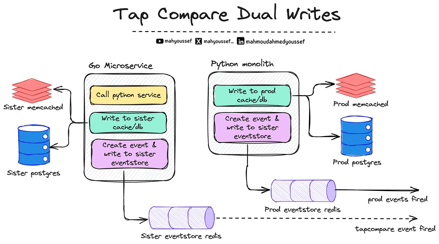 ูุงูุญู ูุงู ุฅููุง ูุนู ู 3 sister datastores ุฌุฏูุฏุฉ โ ู ุฎุตูุตุฉ ููู tap compare testing โ ูุงููู ููุชุจ ูููุง ูููู ุจุณ ุงูู new Go microservice endpoints. ูุจูุฏู ููุฏุฑ ููุงุฑู ุงููู ุงุชูุชุจ ูู production datastores ุจูุงุณุทุฉ ุงูู old endpointุ ู ุน ุงููู ุงุชูุชุจ ูู sister datastores ุจูุงุณุทุฉ ุงูู new endpointโฆ ู ู ุบูุฑ ู ุง ุงูู new endpoint ูุจููุธ ุฃู ููุชุจ ููู production data.
