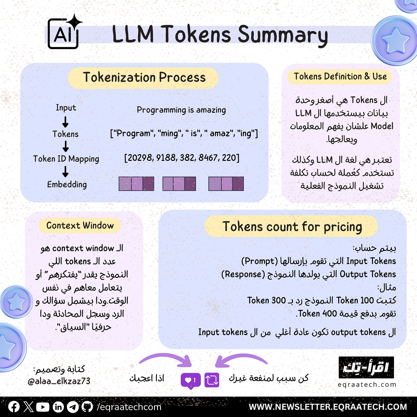 لما بنستخدم ونشتغل مع ال LLMs بنلاقي دايمًا تكرار لاستخدام كلمة Tokens سواء في الاشتراك مقابل عدد من ال Tokens سواء في ال Context window وغيرها، في ورقة النهارده هنعرف يعني ايه Tokens في عالم ال LLMs، أهميتها و ليه مع الوقت مبقتش بس لغة ال LLMs بس كمان عُملتها!