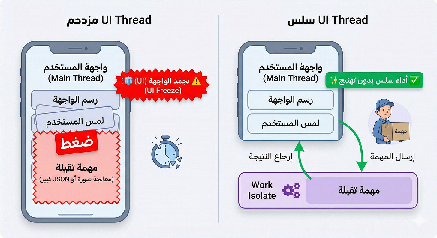 ف كدا أما دماغك بتنضغط تركيزك بيقل ف برضو أي شغل تقيل علي ال Main Thread بيخلي التطبيق يهنّج و الـ UI يحصله Freeze